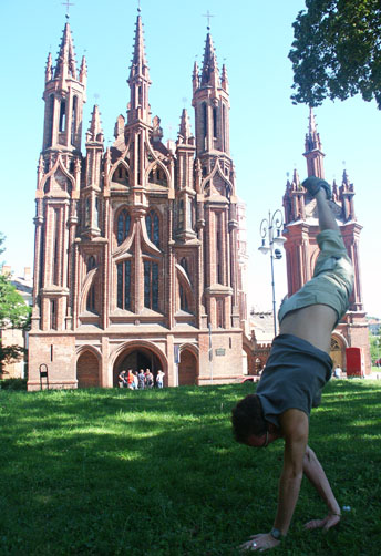 Practising my breakdancing in front of the 16th-century St. Annes Church.