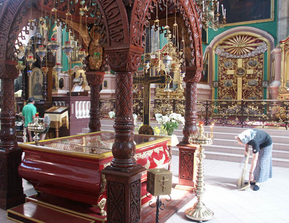 A church-member cleans the floor surrounding a glass case containing the preserved bodies of three 14th-century matyrs, inside the pink 17th-century Holy Spirit Church.