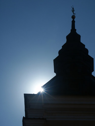 The sun peeking from behind one of Vilnius's many towering church spires.
