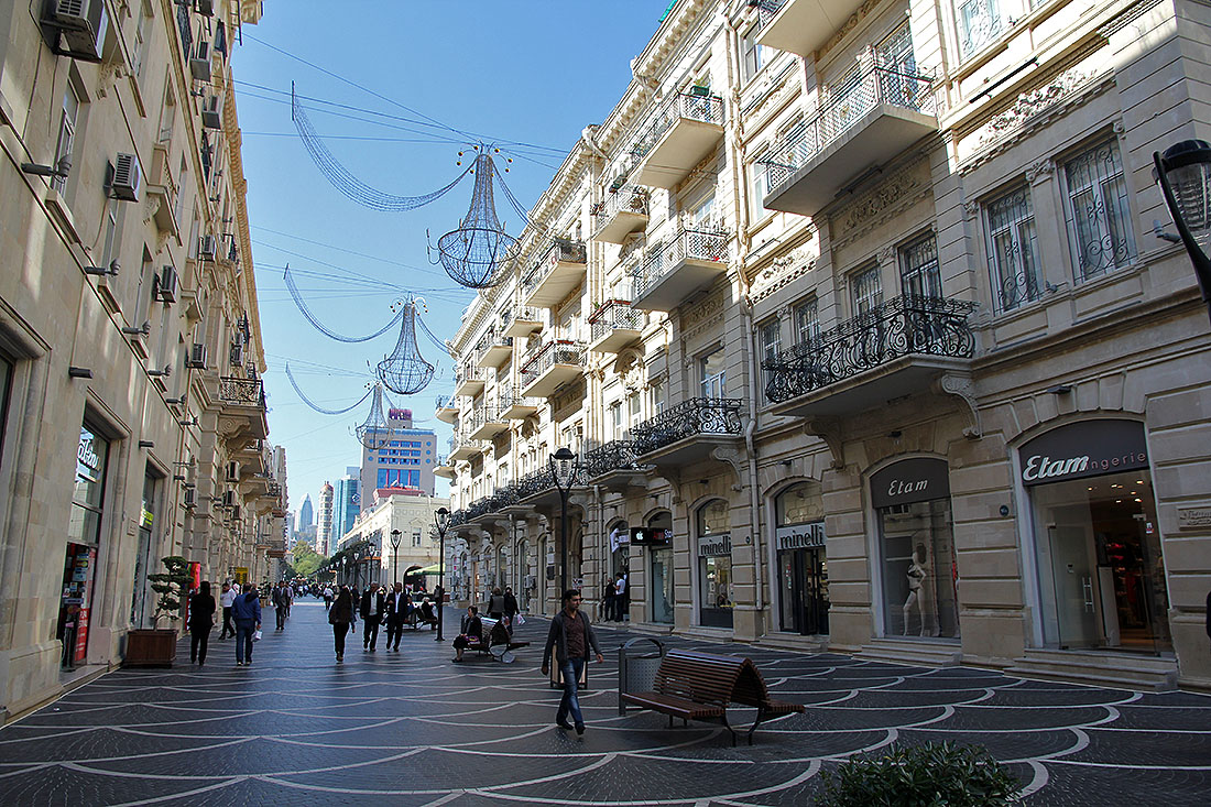 Bulvar - the boulevard that runs along the Caspian Sea - at night.